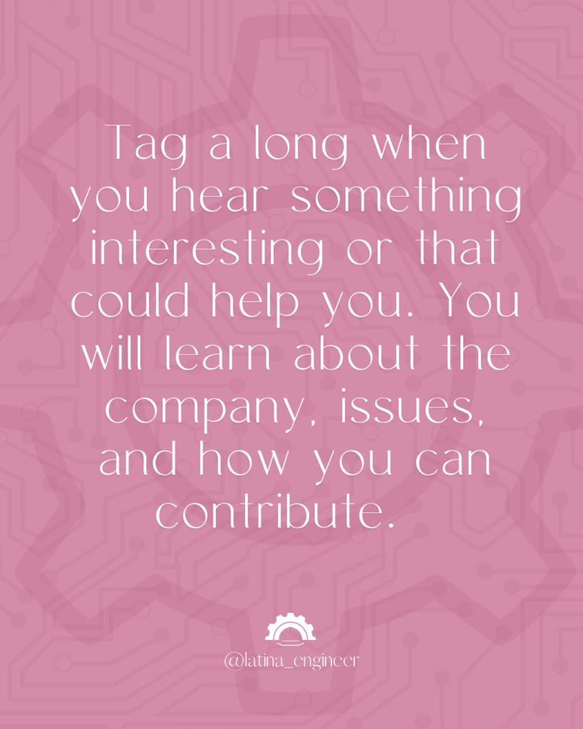 Other than that, I tend to tag a long when I hear something interesting or that could help me. I also ask tons of questions, people actually like it (at least this far they have). It shows them I am interested and also develops teamwork.